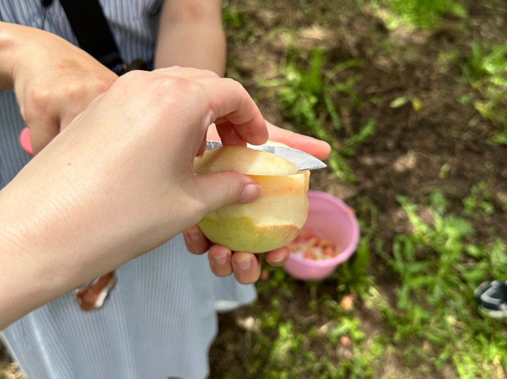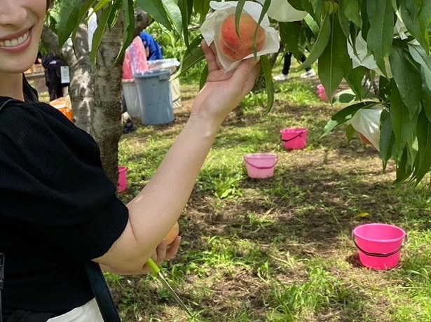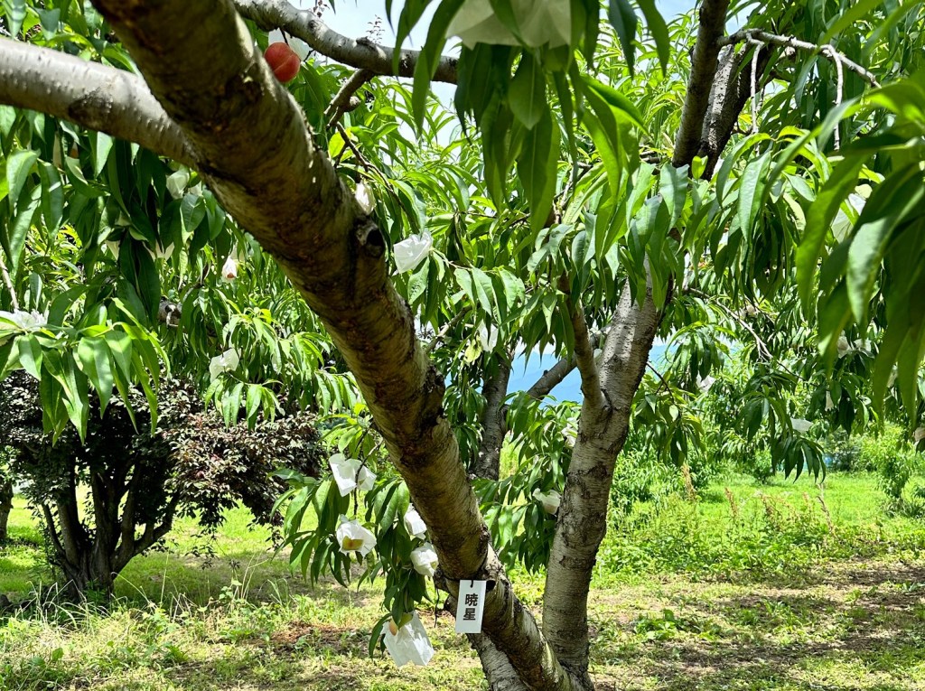 硬いももを食べたい人は木から、柔らかく熟しているももが食べたい人はスタッフさんのいる机から桃を取るような感じでした。