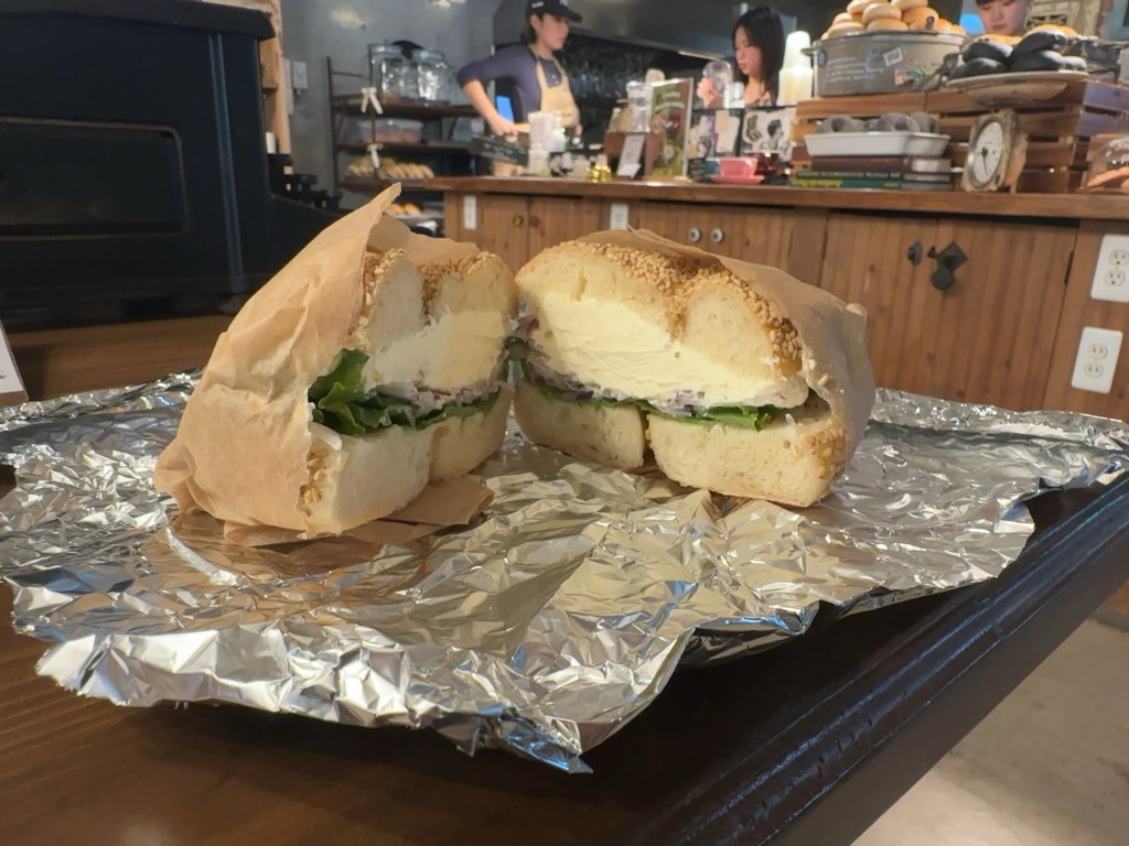 セサミとクリームチーズの相性はやはり抜群でした。間に入っているタマネギはシャキシャキで、この日1日中、口の中でオニオンを感じさせてくれました(笑)