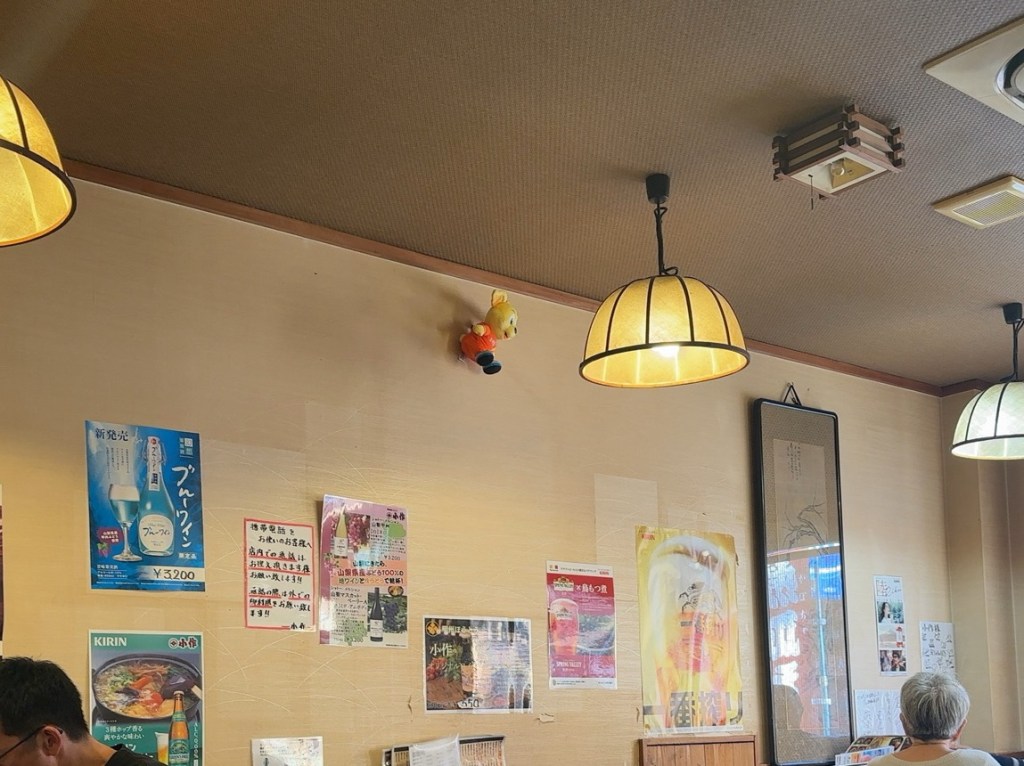 壁には謎のぬいぐるみが、、傾いているし、何だったんだろう、、