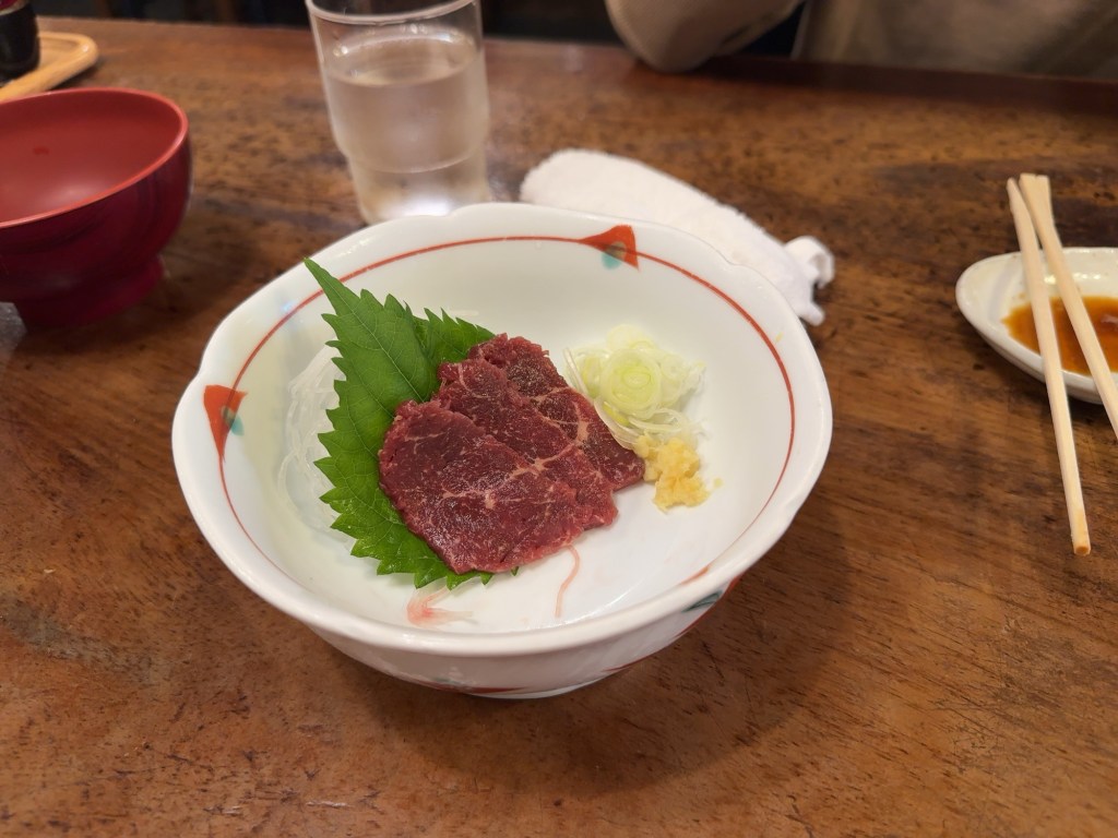 もう3枚ぐらい食べた後の写真ですが、大好物の馬刺しも食べました!ニンニクショウガと一緒に醤油で食べて、んん~!最高。