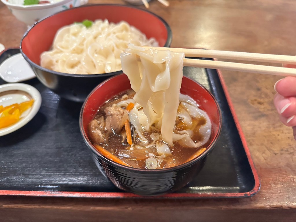 私が注文していたのは冷たいほうとう「おざら」という食べ物。山梨県を代表とする郷土料理です!