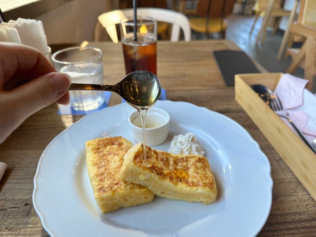 シロップはメイプルシロップか、ハチミツから選べるそうでハチミツに🍯(スプーンにうっすら顔が映っているの、おもしろい)