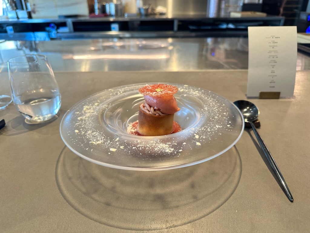 またシェフが最初の説明の時に言っていた「のせている三つ葉は酸味がある」の言葉が気になって、妹と1番に食べてみました(笑)