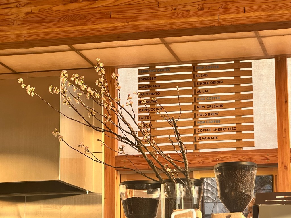 コーヒーマシンの奥にはメニュー表!と、季節の桜が飾られていましたよ🌸